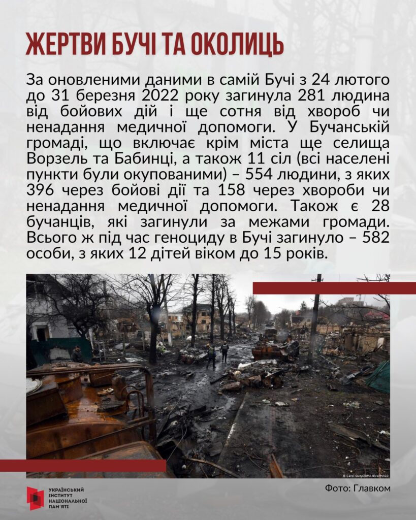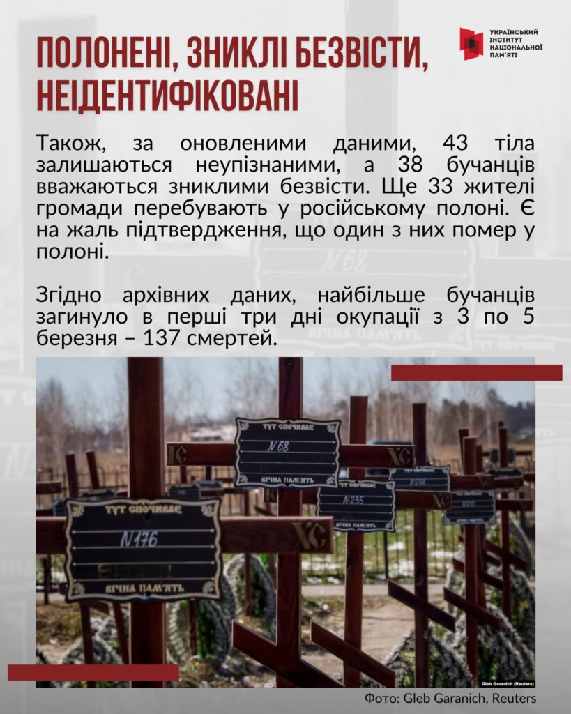 Коли українські Сили безпеки та оборони потрапили в деокуповане місто, стало зрозуміло, що російський окупаційний контингент здійснив масові воєнні злочини й акти геноциду проти цивільного населення. Нещодавно архівний відділ Бучанської міської ради оприлюднив нові дані про кількість жертв російської окупації. Докладніше про це також у матеріалі BBC News Ukrainian.