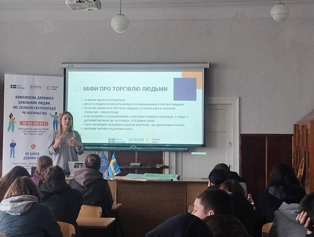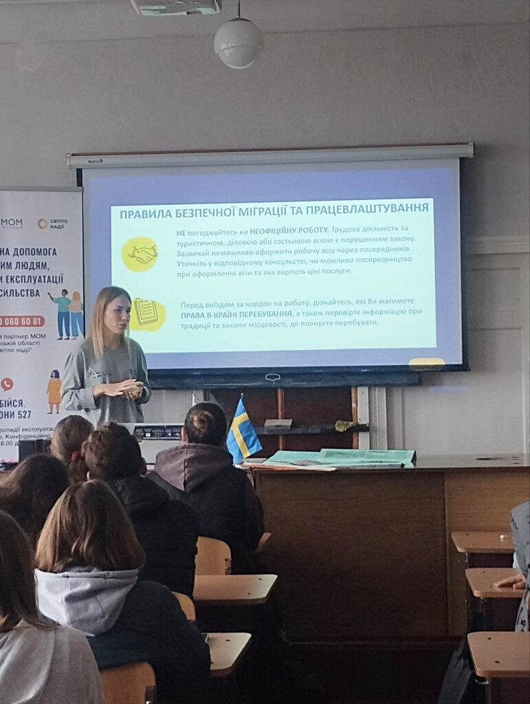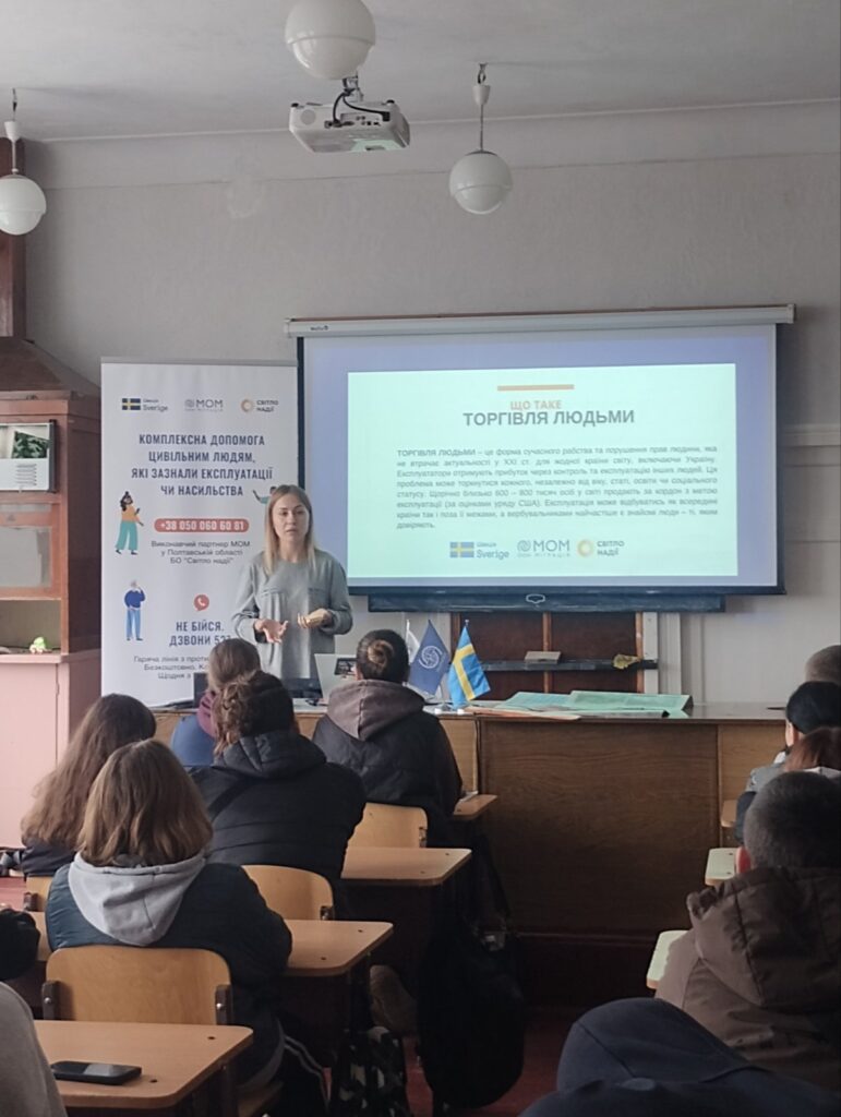Торгівля людьми — протизаконна торгівля в цілях комерційної сексуальної експлуатації або примусової праці – сучасна форма рабства. Жертвою торгівлі людьми може стати будь-хто, будь-яка людина, незалежно від статі, віку, соціального статусу, рівня освіти тощо. Тому наразі важливо бути обізнаним з цього питання, що допоможе не стати жертвою торгівців-злочинців. Тож сьогодні у Гоголівському ліцеї та Центрі надання соціальних послуг соціальною працівницею БО “Світло Надії” Катериною Чуб, спільно із відділами освіти та соціального захисту громади, було проведено інформаційні заходи, котрі мали на меті поінформувати ліцеїстів 10- 11 класів та працівників згаданих відділів виконавчого комітету щодо проблеми торгівлі людьми, з’ясувати причини цього явища, позбавити міфів та стереотипів стосовно нього. Сподіваємося, що отримана інформація допоможе учасникам сьогоднішнього зібрання не лише не стати жертвою торгівлі людьми самим, а й убезпечити від цієї біди своїх ближніх. Щиро дякуємо за віддані знання і турботу про майбутнє нинішніх школярів організаторам та спікерці заходу! Ознайомлений – значить озброєний! Миру всім українцям!
