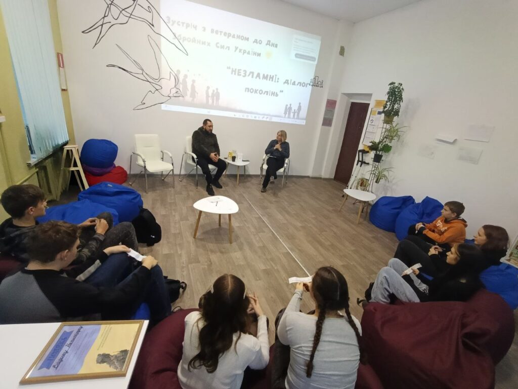 З нагоди Дня Збройних Сил України у молодіжному просторі KOLOMOLOді відбувся захід «Незламні: діалог поколінь». Для учнів ліцею № 4 Пирятинської громада керівник центру Інна Моторна організувала зустріч із ветераном війни, пирятинцем Вадимом Нечипоруком.