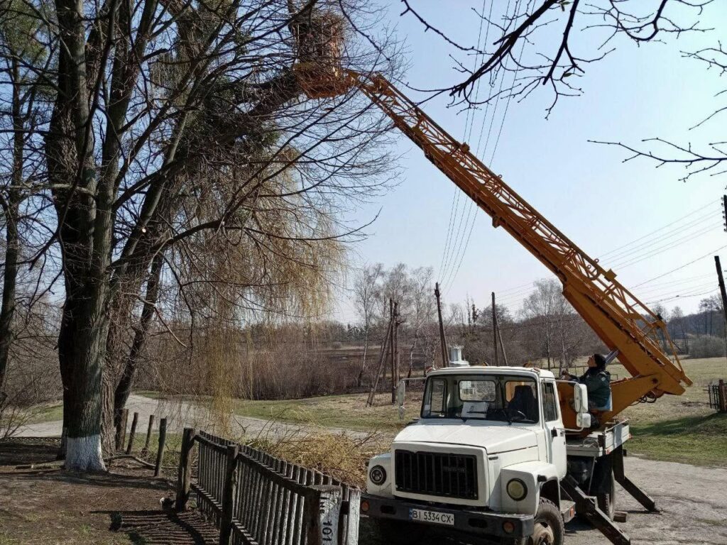 У с.Пірки за допомогою автовежі працівники відділу благоустрою міської ради проводили санітарне видалення дерев та обрізання гілок. Прибирати гілля допомагали працівники сільського клубу та бібліотеки.