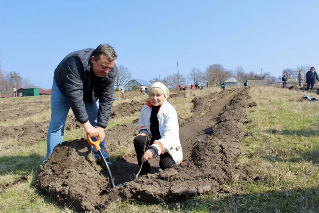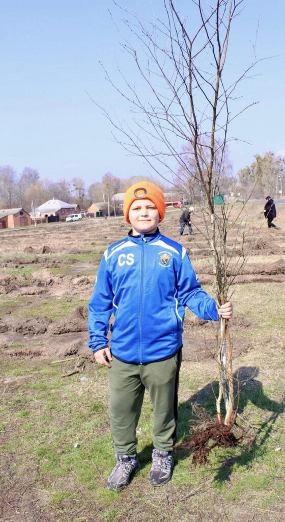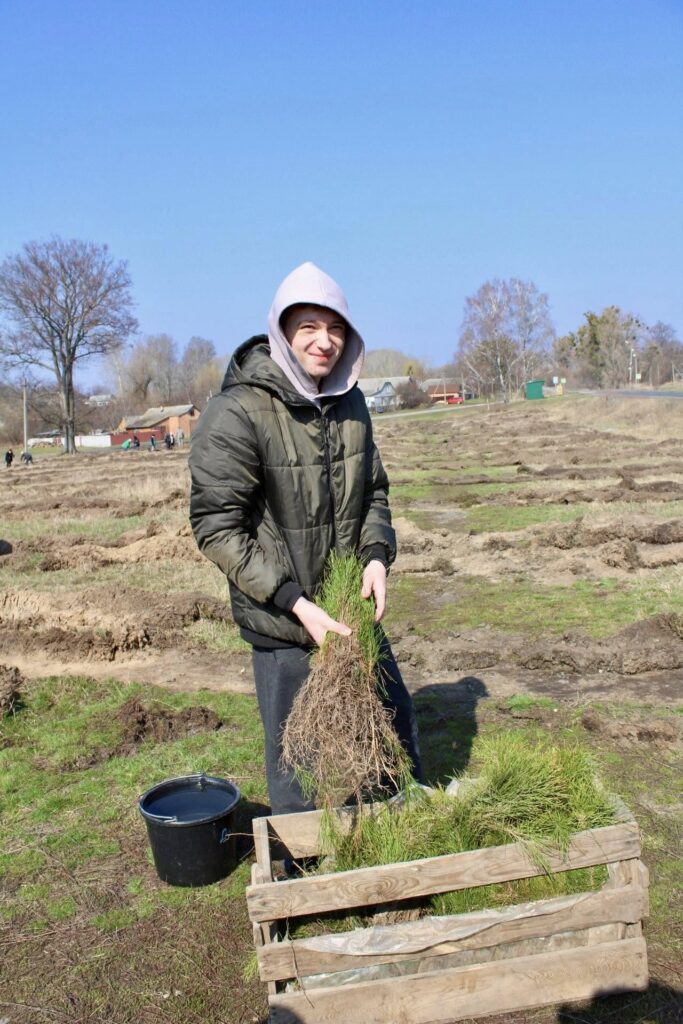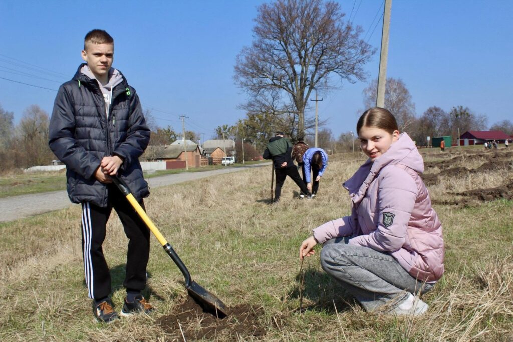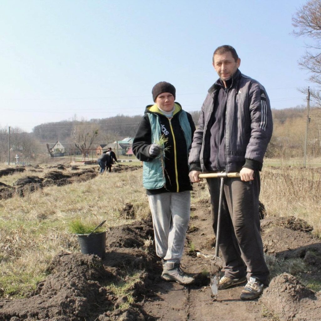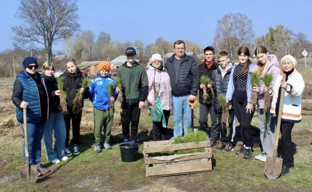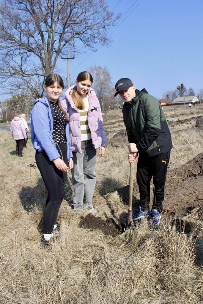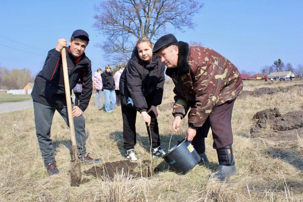 Петро Косяк, майстер виробничого навчання Регіонального центру професійно-технічної освіти міста Зіньків, показував дорослим і дітям як правильно саджати горіхи, сосни та берізки, щоб вони прижилися.