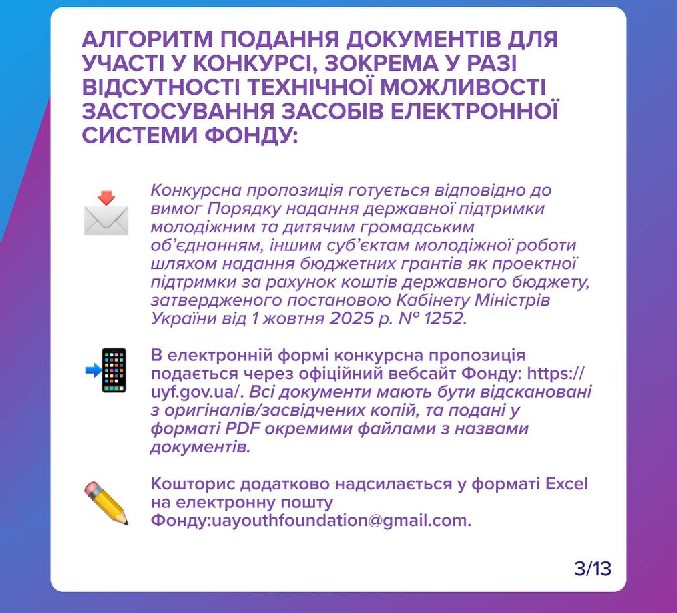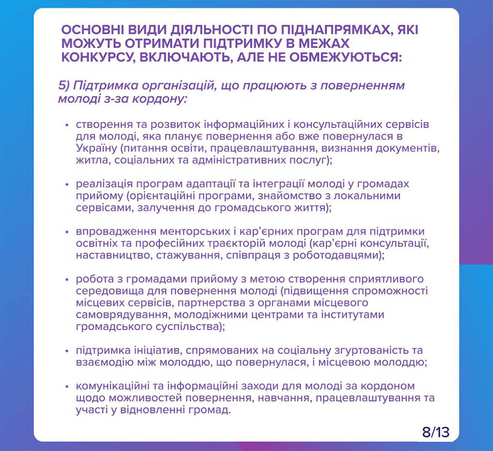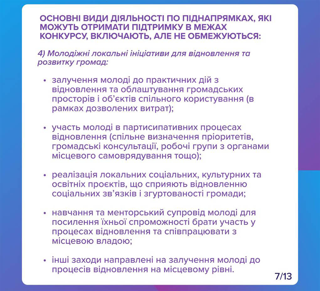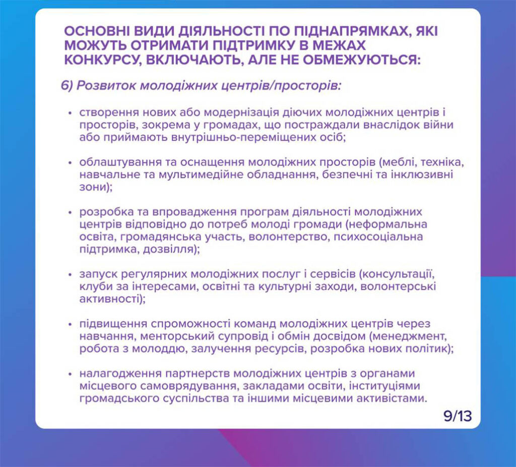 👥 Хто може брати участь: молодіжні та дитячі ГО, центри, простори, органи студентського самоврядування та юридичні особи, що працюють із молоддю.